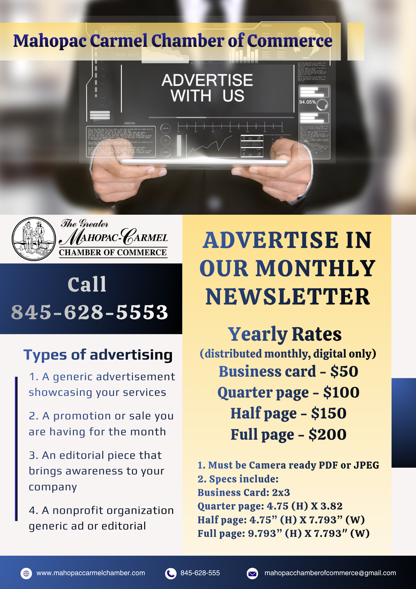 In the role of a partnership of area business and professional people, the Greater Mahopac-Carmel Chamber of Commerce works to promote a healthy local economy, with increased demand for goods and services that will ultimately benefit every area's business.